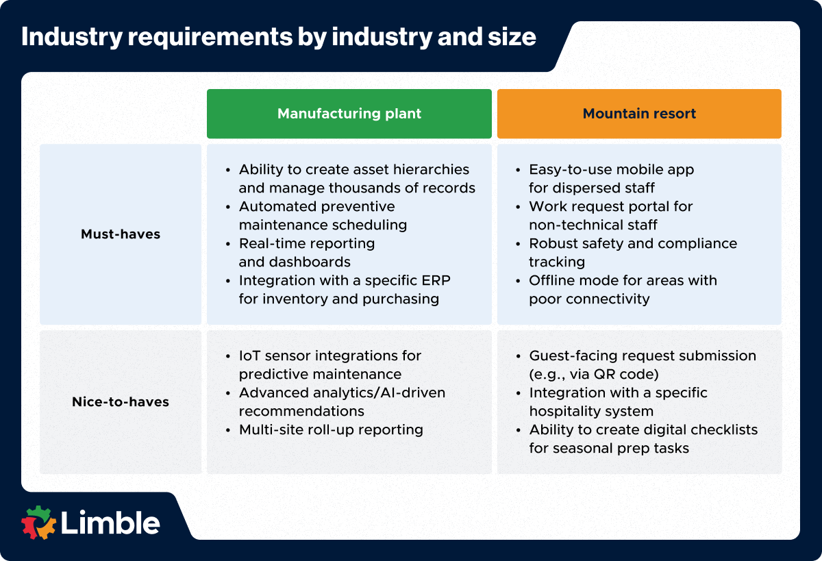 سیستم برای تیمی با مقیاس حدود ۱۲۰۰ نفر، ۳ خط فعال تولید، و بیش از ۱۰,۰۰۰ دارایی قابل نگهداشت ارزیابی میشود. تمرکز در این مقیاس، بر کاهش توقفهای ناخواسته و بهبود اجرای نگهداشت برنامهریزیشده است. الزامات ضروری معمولاً شامل قابلیتهای زیر هستند: